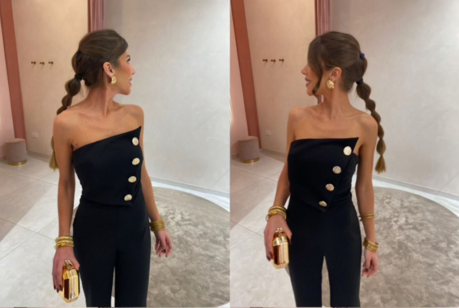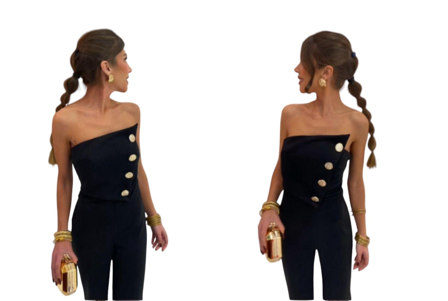 Este macacão preto é a definição de sofisticação e requinte .Com design assimétrico e botões dourados elegantes, cria um visual imponente e irresistível.